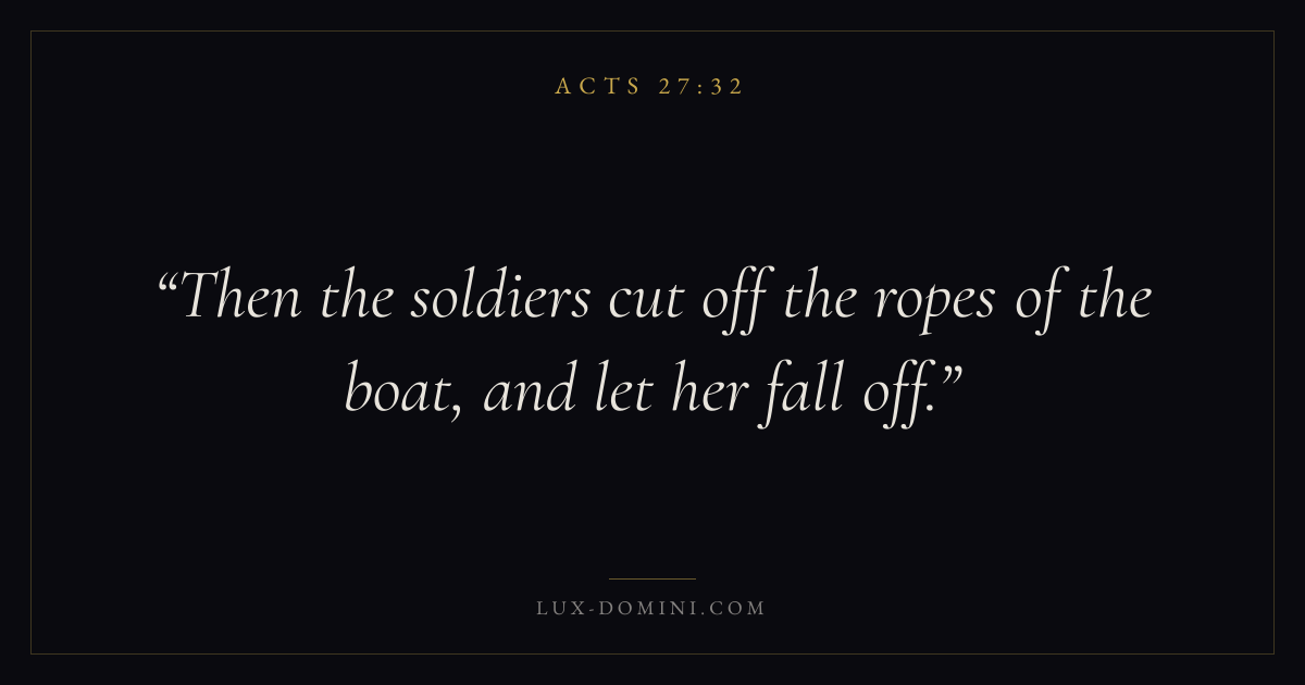 Books / Acts / Chapter 27 / Verse 32 ← Acts 27:31 Acts 27:32 Acts 27:33 → Then the soldiers cut off the ropes of the boat, and let her fall off. Download verse card Share on Twitter Share on Facebook Pin it ✦ Key themes FaithSuffering and trialsPrayerSalvationSpirit Read with Acts 27:31Acts 27:33Hebrews 11:1Romans 10:17 Related topics Bible verses about faithBible verses about suffering and trialsBible verses about prayerBible verses about salvation ✦ Acts Chapter 27 verses V. 1 V. 2 V. 3 V. 4 V. 5 V. 6 V. 7 V. 8 V. 9 V. 10 V. 11 V. 12 V. 13 V. 14 V. 15 V. 16 V. 17 V. 18 V. 19 V. 20 V. 21 V. 22 V. 23 V. 24 V. 25 V. 26 V. 27 V. 28 V. 29 V. 30 V. 31 V. 32 V. 33 V. 34 V. 35 V. 36 V. 37 V. 38 V. 39 V. 40 V. 41 V. 42 V. 43 V. 44