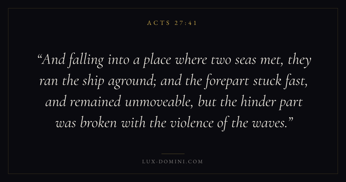 And falling into a place where two seas met, they ran the ship aground; and the forepart stuck fast, and remained unmoveable, but the hinder part was broken with the violence of the waves.