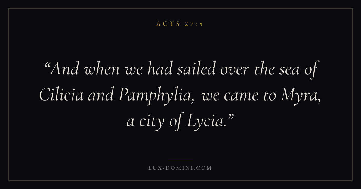 And when we had sailed over the sea of Cilicia and Pamphylia, we came to Myra, a city of Lycia.