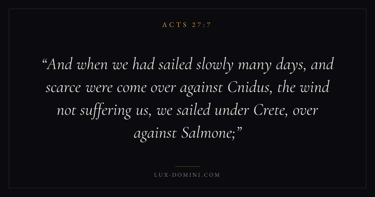 And when we had sailed slowly many days, and scarce were come over against Cnidus, the wind not suffering us, we sailed under Crete, over against Salmone;
