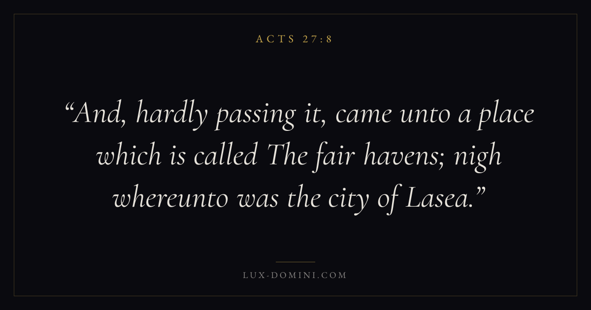 And, hardly passing it, came unto a place which is called The fair havens; nigh whereunto was the city of Lasea.