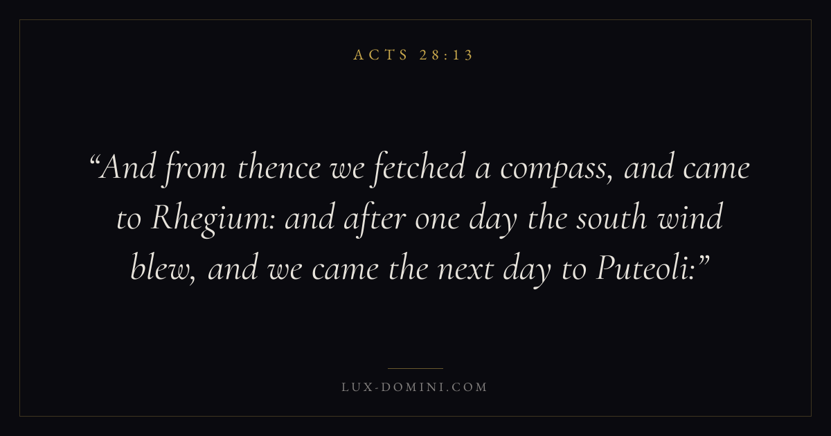 And from thence we fetched a compass, and came to Rhegium: and after one day the south wind blew, and we came the next day to Puteoli: