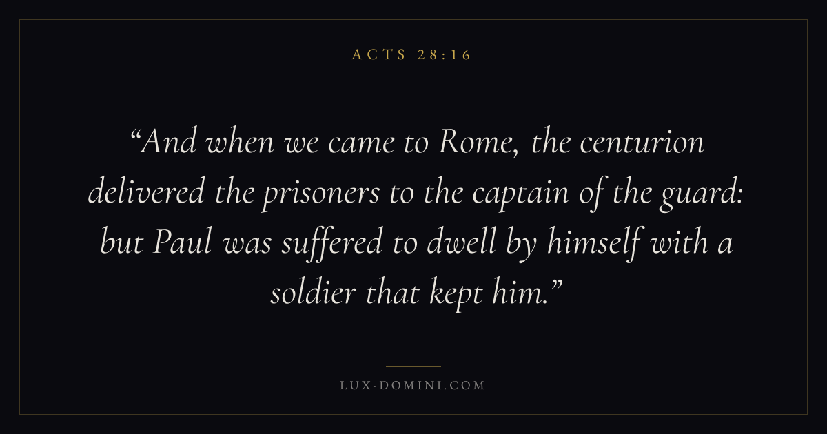 And when we came to Rome, the centurion delivered the prisoners to the captain of the guard: but Paul was suffered to dwell by himself with a soldier that kept him.
