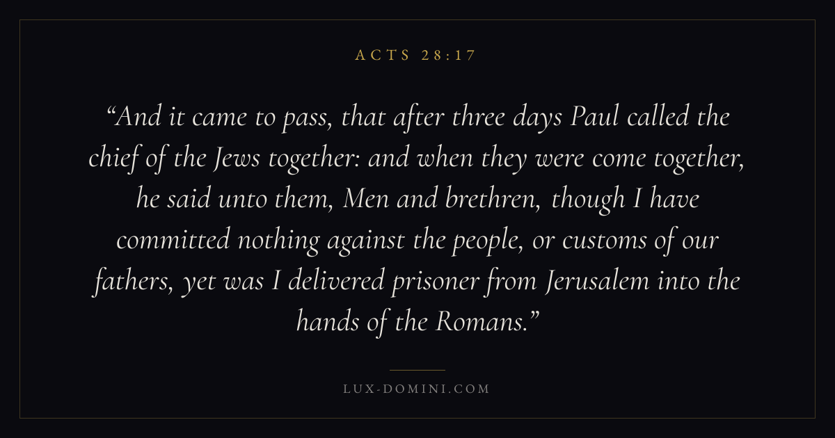 And it came to pass, that after three days Paul called the chief of the Jews together: and when they were come together, he said unto them, Men and brethren, though I have committed nothing against the people, or customs of our fathers, yet was I delivered prisoner from Jerusalem into the hands of the Romans.
