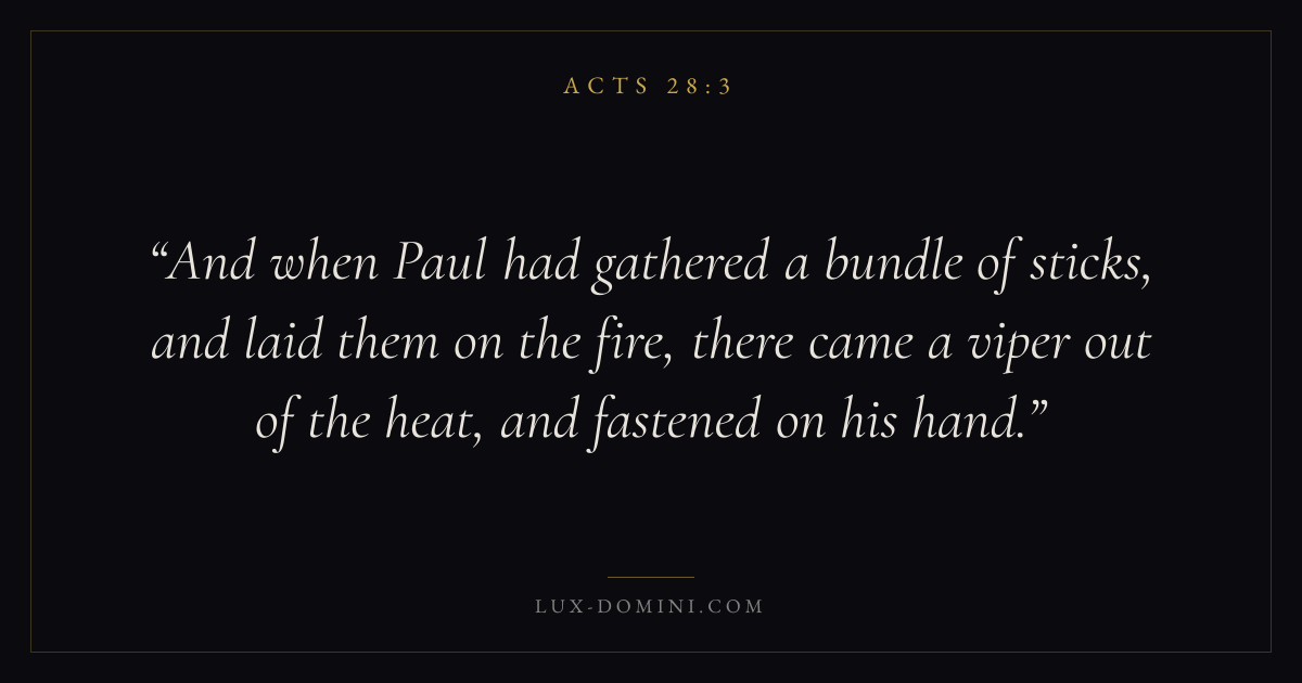 And when Paul had gathered a bundle of sticks, and laid them on the fire, there came a viper out of the heat, and fastened on his hand.