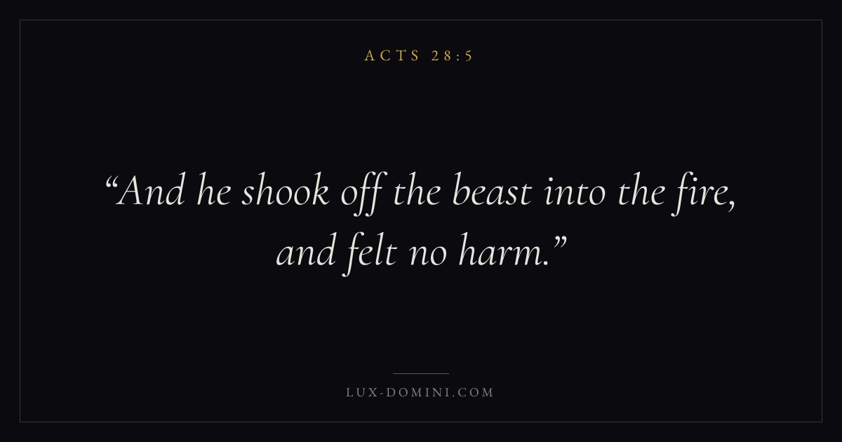 Books / Acts / Chapter 28 / Verse 5 ← Acts 28:4 Acts 28:5 Acts 28:6 → And he shook off the beast into the fire, and felt no harm. Download verse card Share on Twitter Share on Facebook Pin it ✦ Key themes Suffering and trialsPrayerTruthSpirit Read with Acts 28:1Acts 28:2Romans 8:182 Corinthians 4:17 Related topics Bible verses about suffering and trialsBible verses about prayerBible verses about truth ✦ Acts Chapter 28 verses V. 1 V. 2 V. 3 V. 4 V. 5 V. 6 V. 7 V. 8 V. 9 V. 10 V. 11 V. 12 V. 13 V. 14 V. 15 V. 16 V. 17 V. 18 V. 19 V. 20 V. 21 V. 22 V. 23 V. 24 V. 25 V. 26 V. 27 V. 28 V. 29 V. 30 V. 31