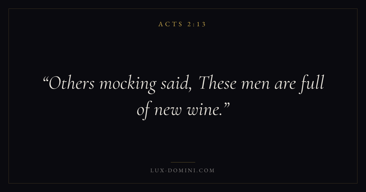 Books / Acts / Chapter 2 / Verse 13 ← Acts 2:12 Acts 2:13 Acts 2:14 → Others mocking said, These men are full of new wine. Download verse card Share on Twitter Share on Facebook Pin it ✦ Key themes Suffering and trialsPrayerWisdomGraceSpirit Read with Acts 2:9Acts 2:10Romans 8:182 Corinthians 4:17 Related topics Bible verses about suffering and trialsBible verses about prayerBible verses about wisdomBible verses about grace ✦ Acts Chapter 2 verses V. 1 V. 2 V. 3 V. 4 V. 5 V. 6 V. 7 V. 8 V. 9 V. 10 V. 11 V. 12 V. 13 V. 14 V. 15 V. 16 V. 17 V. 18 V. 19 V. 20 V. 21 V. 22 V. 23 V. 24 V. 25 V. 26 V. 27 V. 28 V. 29 V. 30 V. 31 V. 32 V. 33 V. 34 V. 35 V. 36 V. 37 V. 38 V. 39 V. 40 V. 41 V. 42 V. 43 V. 44 V. 45 V. 46 V. 47
