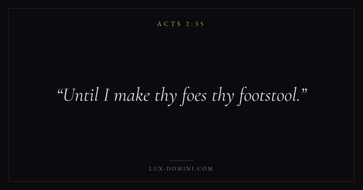 Books / Acts / Chapter 2 / Verse 35 ← Acts 2:34 Acts 2:35 Acts 2:36 → Until I make thy foes thy footstool. Download verse card Share on Twitter Share on Facebook Pin it ✦ Key themes Suffering and trialsPrayerGraceTruthSpirit Read with Acts 2:32Acts 2:33Romans 8:182 Corinthians 4:17 Related topics Bible verses about suffering and trialsBible verses about prayerBible verses about graceBible verses about truth ✦ Acts Chapter 2 verses V. 1 V. 2 V. 3 V. 4 V. 5 V. 6 V. 7 V. 8 V. 9 V. 10 V. 11 V. 12 V. 13 V. 14 V. 15 V. 16 V. 17 V. 18 V. 19 V. 20 V. 21 V. 22 V. 23 V. 24 V. 25 V. 26 V. 27 V. 28 V. 29 V. 30 V. 31 V. 32 V. 33 V. 34 V. 35 V. 36 V. 37 V. 38 V. 39 V. 40 V. 41 V. 42 V. 43 V. 44 V. 45 V. 46 V. 47
