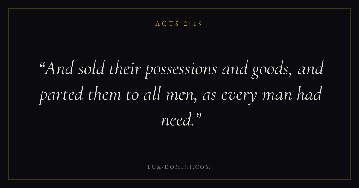 Books / Acts / Chapter 2 / Verse 45 ← Acts 2:44 Acts 2:45 Acts 2:46 → And sold their possessions and goods, and parted them to all men, as every man had need. Download verse card Share on Twitter Share on Facebook Pin it ✦ Key themes Suffering and trialsPrayerTruthSpirit Read with Acts 2:41Acts 2:42Romans 8:182 Corinthians 4:17 Related topics Bible verses about suffering and trialsBible verses about prayerBible verses about truth ✦ Acts Chapter 2 verses V. 1 V. 2 V. 3 V. 4 V. 5 V. 6 V. 7 V. 8 V. 9 V. 10 V. 11 V. 12 V. 13 V. 14 V. 15 V. 16 V. 17 V. 18 V. 19 V. 20 V. 21 V. 22 V. 23 V. 24 V. 25 V. 26 V. 27 V. 28 V. 29 V. 30 V. 31 V. 32 V. 33 V. 34 V. 35 V. 36 V. 37 V. 38 V. 39 V. 40 V. 41 V. 42 V. 43 V. 44 V. 45 V. 46 V. 47