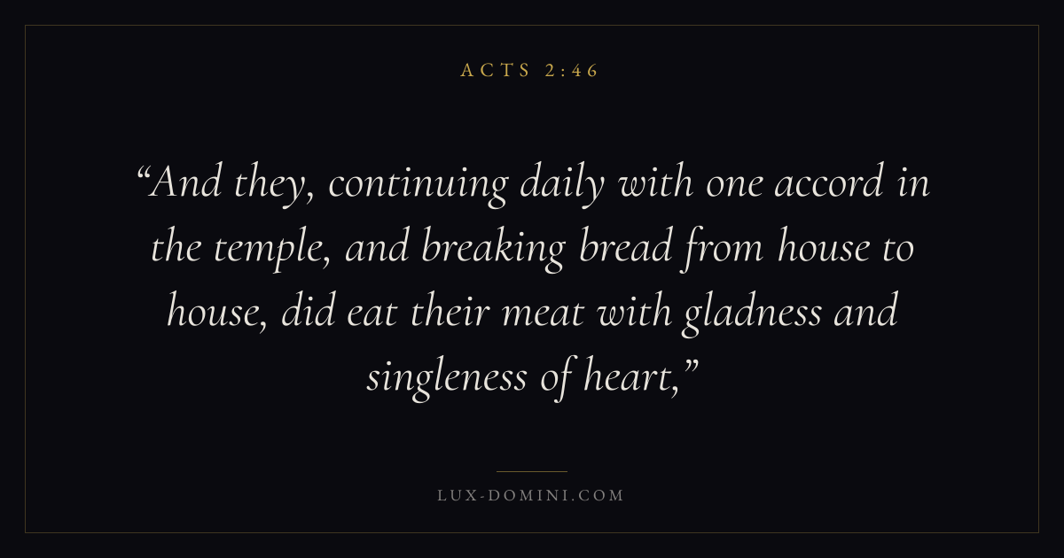 And they, continuing daily with one accord in the temple, and breaking bread from house to house, did eat their meat with gladness and singleness of heart,