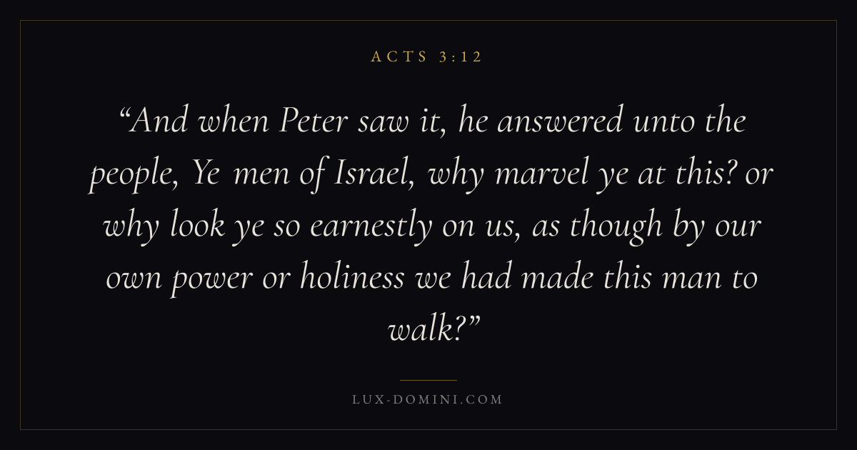And when Peter saw it, he answered unto the people, Ye men of Israel, why marvel ye at this? or why look ye so earnestly on us, as though by our own power or holiness we had made this man to walk?
