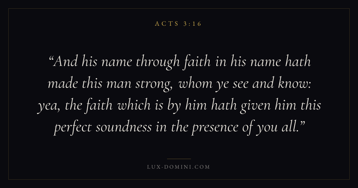 And his name through faith in his name hath made this man strong, whom ye see and know: yea, the faith which is by him hath given him this perfect soundness in the presence of you all.