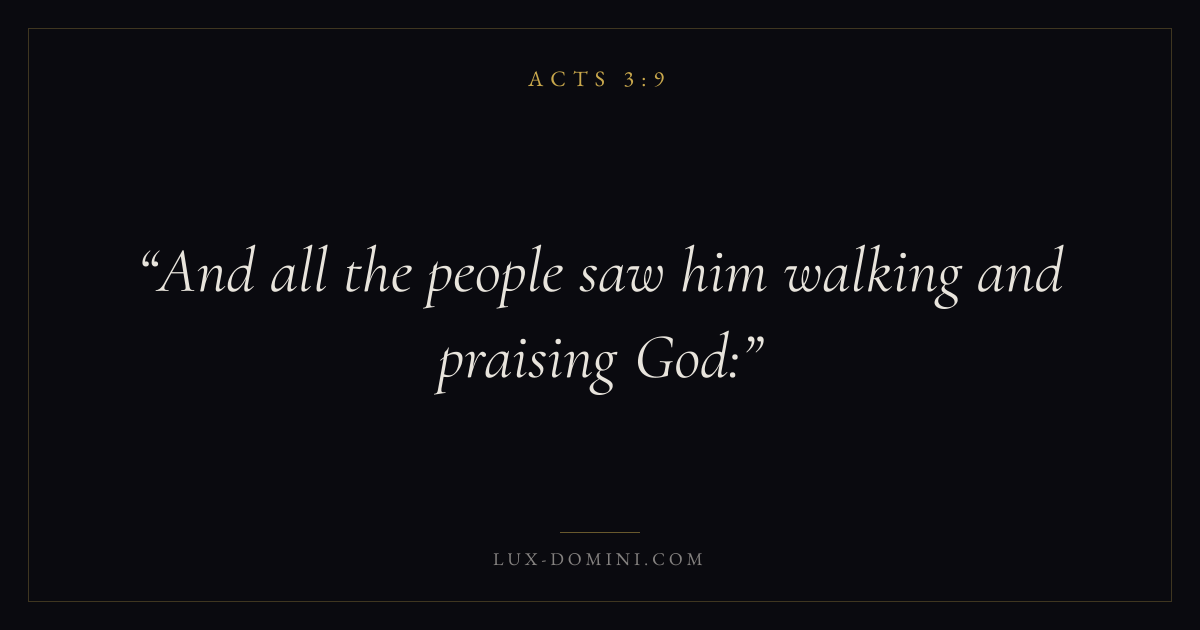 Books / Acts / Chapter 3 / Verse 9 ← Acts 3:8 Acts 3:9 Acts 3:10 → And all the people saw him walking and praising God: Download verse card Share on Twitter Share on Facebook Pin it ✦ Key themes Suffering and trialsPrayerTruthSpirit Read with Acts 3:6Acts 3:7Romans 8:182 Corinthians 4:17 Related topics Bible verses about suffering and trialsBible verses about prayerBible verses about truth ✦ Acts Chapter 3 verses V. 1 V. 2 V. 3 V. 4 V. 5 V. 6 V. 7 V. 8 V. 9 V. 10 V. 11 V. 12 V. 13 V. 14 V. 15 V. 16 V. 17 V. 18 V. 19 V. 20 V. 21 V. 22 V. 23 V. 24 V. 25 V. 26