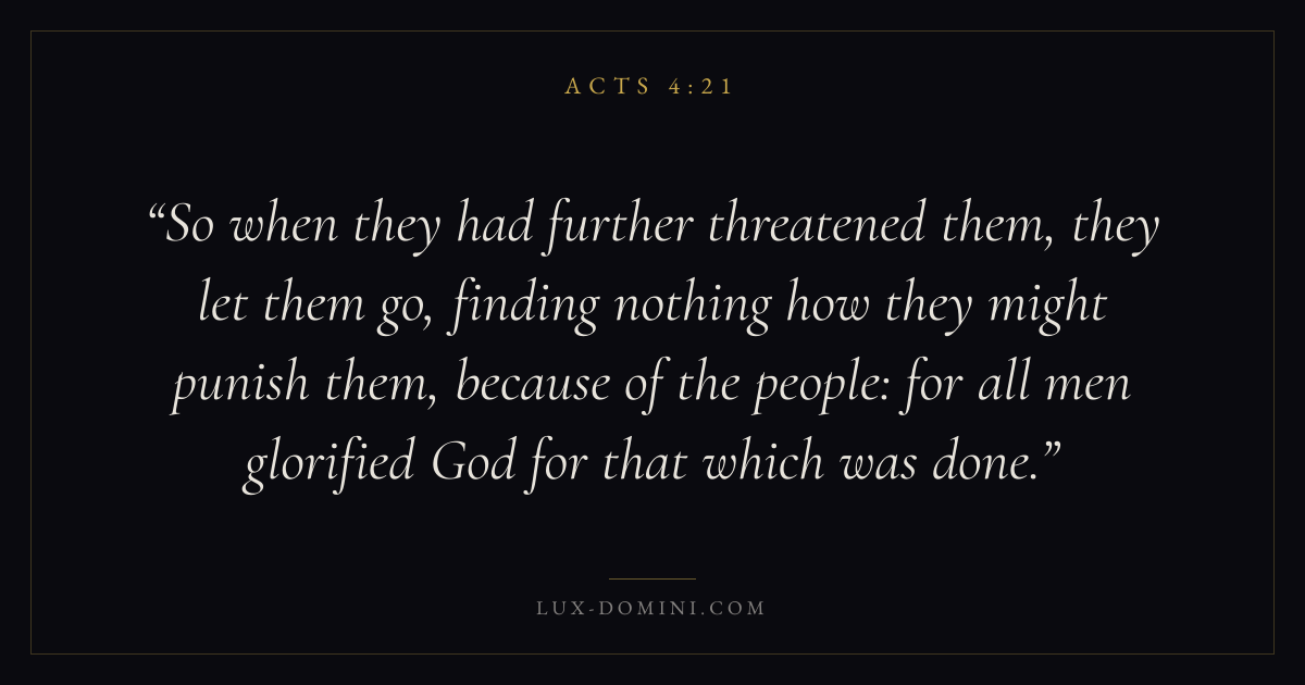 So when they had further threatened them, they let them go, finding nothing how they might punish them, because of the people: for all men glorified God for that which was done.