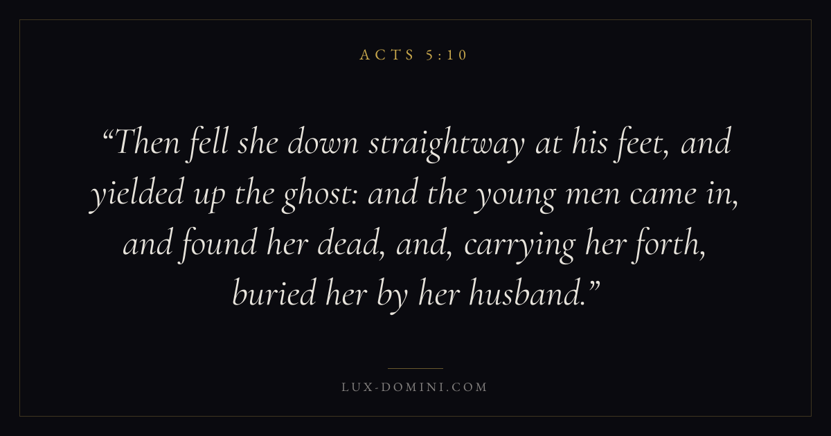 Then fell she down straightway at his feet, and yielded up the ghost: and the young men came in, and found her dead, and, carrying her forth, buried her by her husband.