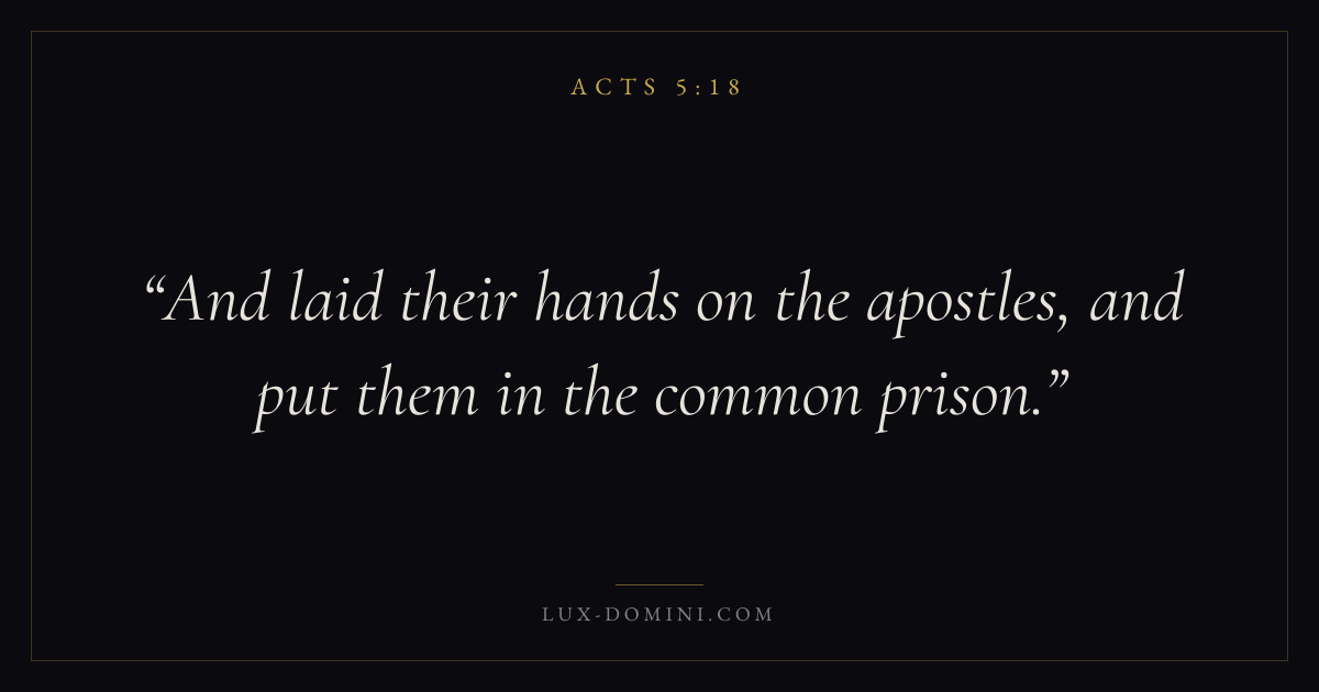 Books / Acts / Chapter 5 / Verse 18 ← Acts 5:17 Acts 5:18 Acts 5:19 → And laid their hands on the apostles, and put them in the common prison. Download verse card Share on Twitter Share on Facebook Pin it ✦ Key themes Suffering and trialsPrayerTruthSpirit Read with Acts 5:17Acts 5:19Romans 8:182 Corinthians 4:17 Related topics Bible verses about suffering and trialsBible verses about prayerBible verses about truth ✦ Acts Chapter 5 verses V. 1 V. 2 V. 3 V. 4 V. 5 V. 6 V. 7 V. 8 V. 9 V. 10 V. 11 V. 12 V. 13 V. 14 V. 15 V. 16 V. 17 V. 18 V. 19 V. 20 V. 21 V. 22 V. 23 V. 24 V. 25 V. 26 V. 27 V. 28 V. 29 V. 30 V. 31 V. 32 V. 33 V. 34 V. 35 V. 36 V. 37 V. 38 V. 39 V. 40 V. 41 V. 42