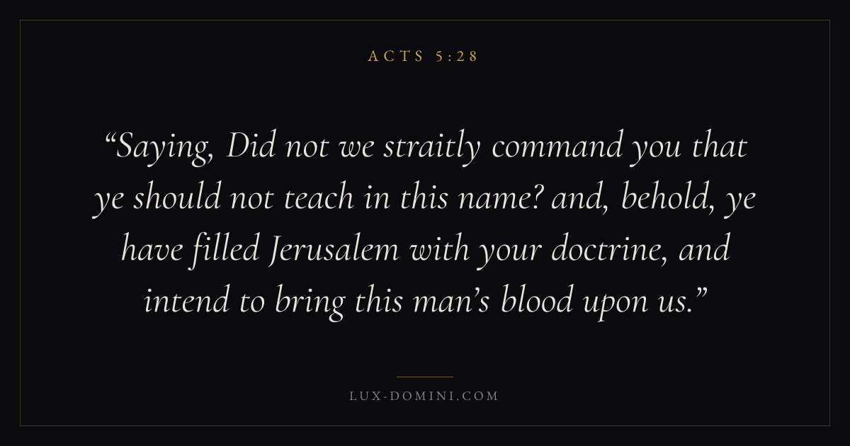 Saying, Did not we straitly command you that ye should not teach in this name? and, behold, ye have filled Jerusalem with your doctrine, and intend to bring this man’s blood upon us.