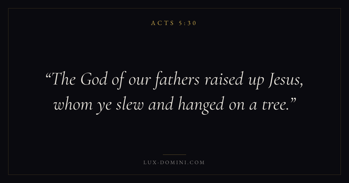 Books / Acts / Chapter 5 / Verse 30 ← Acts 5:29 Acts 5:30 Acts 5:31 → The God of our fathers raised up Jesus, whom ye slew and hanged on a tree. Download verse card Share on Twitter Share on Facebook Pin it ✦ Key themes Suffering and trialsPrayerSalvationTruthSpirit Read with Acts 5:29Acts 5:31Romans 8:182 Corinthians 4:17 Related topics Bible verses about suffering and trialsBible verses about prayerBible verses about salvationBible verses about truth ✦ Acts Chapter 5 verses V. 1 V. 2 V. 3 V. 4 V. 5 V. 6 V. 7 V. 8 V. 9 V. 10 V. 11 V. 12 V. 13 V. 14 V. 15 V. 16 V. 17 V. 18 V. 19 V. 20 V. 21 V. 22 V. 23 V. 24 V. 25 V. 26 V. 27 V. 28 V. 29 V. 30 V. 31 V. 32 V. 33 V. 34 V. 35 V. 36 V. 37 V. 38 V. 39 V. 40 V. 41 V. 42