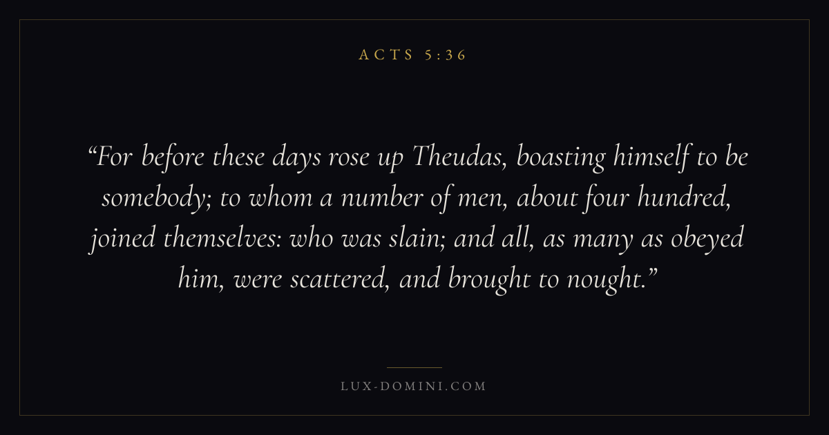 For before these days rose up Theudas, boasting himself to be somebody; to whom a number of men, about four hundred, joined themselves: who was slain; and all, as many as obeyed him, were scattered, and brought to nought.