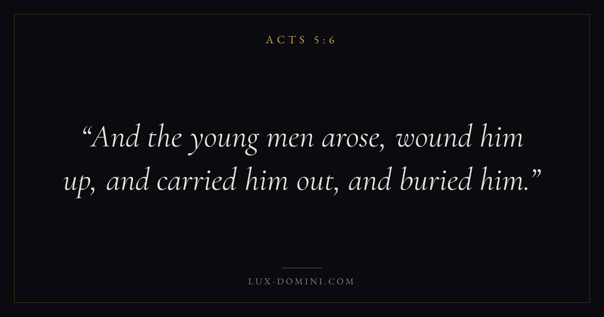 Books / Acts / Chapter 5 / Verse 6 ← Acts 5:5 Acts 5:6 Acts 5:7 → And the young men arose, wound him up, and carried him out, and buried him. Download verse card Share on Twitter Share on Facebook Pin it ✦ Key themes Suffering and trialsPrayerTruthSpirit Read with Acts 5:4Acts 5:5Romans 8:182 Corinthians 4:17 Related topics Bible verses about suffering and trialsBible verses about prayerBible verses about truth ✦ Acts Chapter 5 verses V. 1 V. 2 V. 3 V. 4 V. 5 V. 6 V. 7 V. 8 V. 9 V. 10 V. 11 V. 12 V. 13 V. 14 V. 15 V. 16 V. 17 V. 18 V. 19 V. 20 V. 21 V. 22 V. 23 V. 24 V. 25 V. 26 V. 27 V. 28 V. 29 V. 30 V. 31 V. 32 V. 33 V. 34 V. 35 V. 36 V. 37 V. 38 V. 39 V. 40 V. 41 V. 42