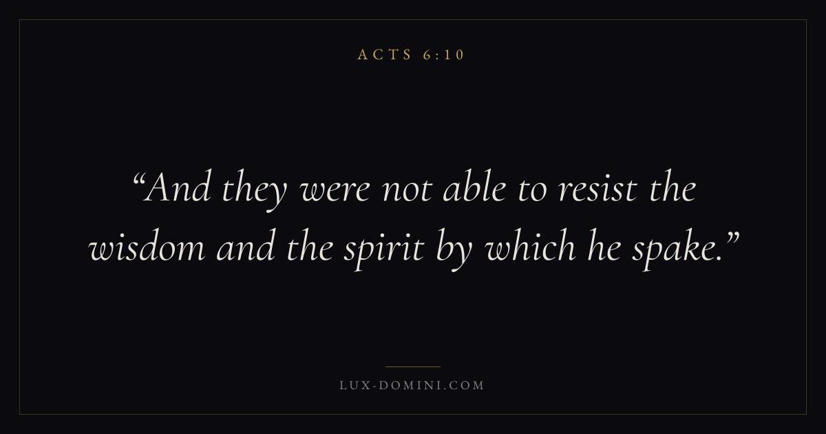 Books / Acts / Chapter 6 / Verse 10 ← Acts 6:9 Acts 6:10 Acts 6:11 → And they were not able to resist the wisdom and the spirit by which he spake. Download verse card Share on Twitter Share on Facebook Pin it ✦ Key themes Suffering and trialsPrayerWisdomTruthSpirit Read with Acts 6:9Acts 6:11Romans 8:182 Corinthians 4:17 Related topics Bible verses about suffering and trialsBible verses about prayerBible verses about wisdomBible verses about truth ✦ Acts Chapter 6 verses V. 1 V. 2 V. 3 V. 4 V. 5 V. 6 V. 7 V. 8 V. 9 V. 10 V. 11 V. 12 V. 13 V. 14 V. 15