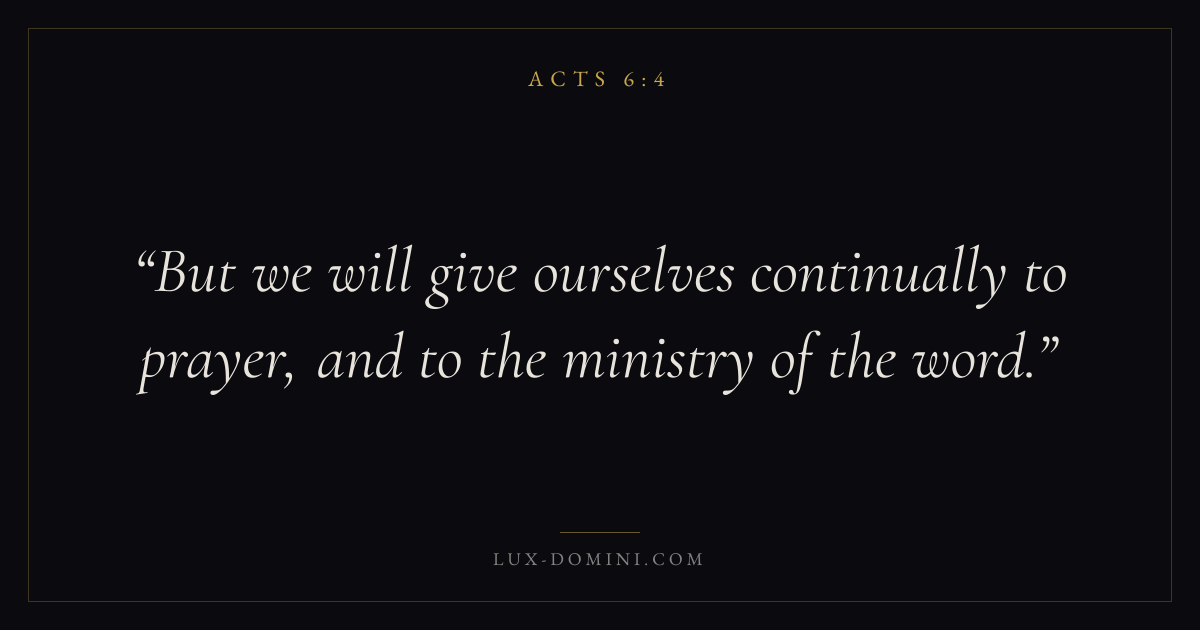 Books / Acts / Chapter 6 / Verse 4 ← Acts 6:3 Acts 6:4 Acts 6:5 → But we will give ourselves continually to prayer, and to the ministry of the word. Download verse card Share on Twitter Share on Facebook Pin it ✦ Key themes Suffering and trialsPrayerTruthSpirit Read with Acts 6:1Acts 6:2Romans 8:182 Corinthians 4:17 Related topics Bible verses about suffering and trialsBible verses about prayerBible verses about truth ✦ Acts Chapter 6 verses V. 1 V. 2 V. 3 V. 4 V. 5 V. 6 V. 7 V. 8 V. 9 V. 10 V. 11 V. 12 V. 13 V. 14 V. 15