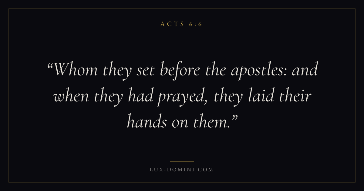 Books / Acts / Chapter 6 / Verse 6 ← Acts 6:5 Acts 6:6 Acts 6:7 → Whom they set before the apostles: and when they had prayed, they laid their hands on them. Download verse card Share on Twitter Share on Facebook Pin it ✦ Key themes Suffering and trialsPrayerTruthSpirit Read with Acts 6:5Acts 6:7Romans 8:182 Corinthians 4:17 Related topics Bible verses about suffering and trialsBible verses about prayerBible verses about truth ✦ Acts Chapter 6 verses V. 1 V. 2 V. 3 V. 4 V. 5 V. 6 V. 7 V. 8 V. 9 V. 10 V. 11 V. 12 V. 13 V. 14 V. 15