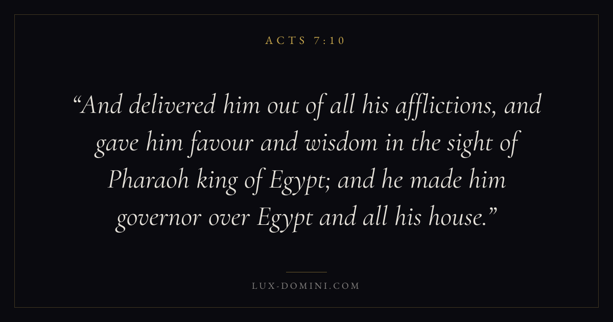 And delivered him out of all his afflictions, and gave him favour and wisdom in the sight of Pharaoh king of Egypt; and he made him governor over Egypt and all his house.