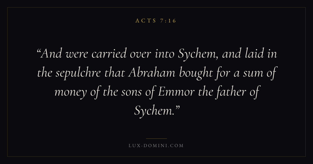 And were carried over into Sychem, and laid in the sepulchre that Abraham bought for a sum of money of the sons of Emmor the father of Sychem.