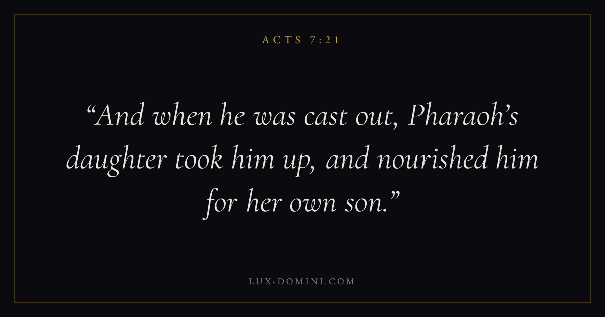 Books / Acts / Chapter 7 / Verse 21 ← Acts 7:20 Acts 7:21 Acts 7:22 → And when he was cast out, Pharaoh’s daughter took him up, and nourished him for her own son. Download verse card Share on Twitter Share on Facebook Pin it ✦ Key themes Suffering and trialsPrayerTruthSpirit Read with Acts 7:20Acts 7:22Romans 8:182 Corinthians 4:17 Related topics Bible verses about suffering and trialsBible verses about prayerBible verses about truth ✦ Acts Chapter 7 verses V. 1 V. 2 V. 3 V. 4 V. 5 V. 6 V. 7 V. 8 V. 9 V. 10 V. 11 V. 12 V. 13 V. 14 V. 15 V. 16 V. 17 V. 18 V. 19 V. 20 V. 21 V. 22 V. 23 V. 24 V. 25 V. 26 V. 27 V. 28 V. 29 V. 30 V. 31 V. 32 V. 33 V. 34 V. 35 V. 36 V. 37 V. 38 V. 39 V. 40 V. 41 V. 42 V. 43 V. 44 V. 45 V. 46 V. 47 V. 48 V. 49 V. 50 V. 51 V. 52 V. 53 V. 54 V. 55 V. 56 V. 57 V. 58 V. 59 V. 60