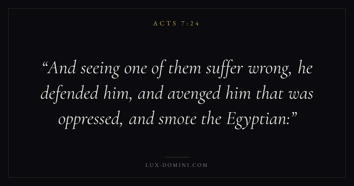 And seeing one of them suffer wrong, he defended him, and avenged him that was oppressed, and smote the Egyptian: