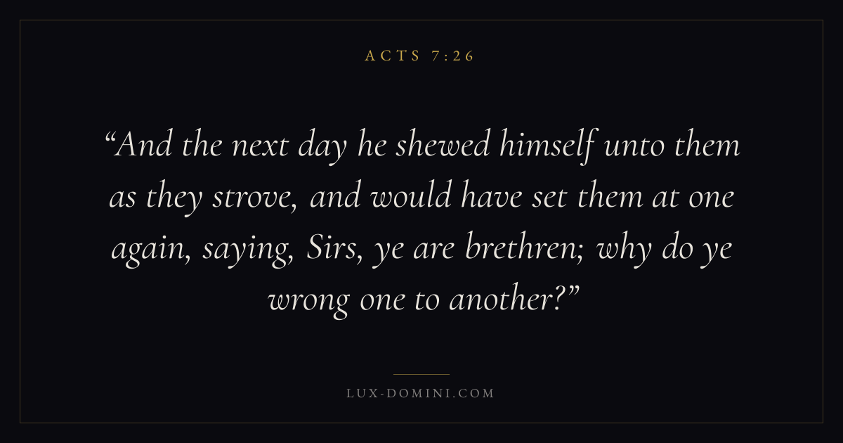 And the next day he shewed himself unto them as they strove, and would have set them at one again, saying, Sirs, ye are brethren; why do ye wrong one to another?