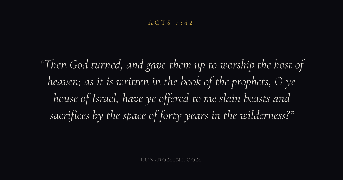 Then God turned, and gave them up to worship the host of heaven; as it is written in the book of the prophets, O ye house of Israel, have ye offered to me slain beasts and sacrifices by the space of forty years in the wilderness?