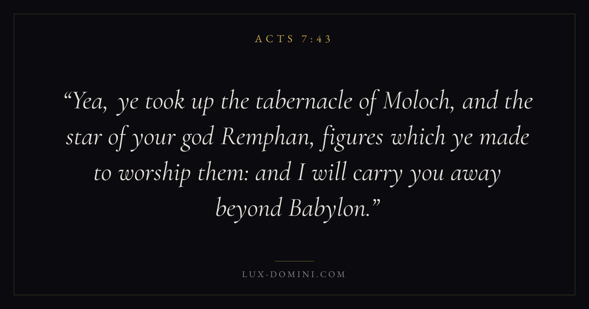 Yea, ye took up the tabernacle of Moloch, and the star of your god Remphan, figures which ye made to worship them: and I will carry you away beyond Babylon.