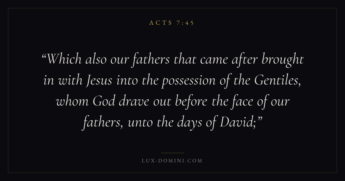 Which also our fathers that came after brought in with Jesus into the possession of the Gentiles, whom God drave out before the face of our fathers, unto the days of David;