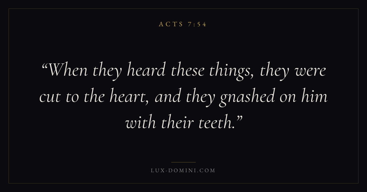When they heard these things, they were cut to the heart, and they gnashed on him with their teeth.