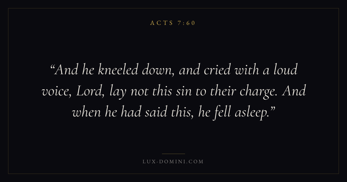 And he kneeled down, and cried with a loud voice, Lord, lay not this sin to their charge. And when he had said this, he fell asleep.