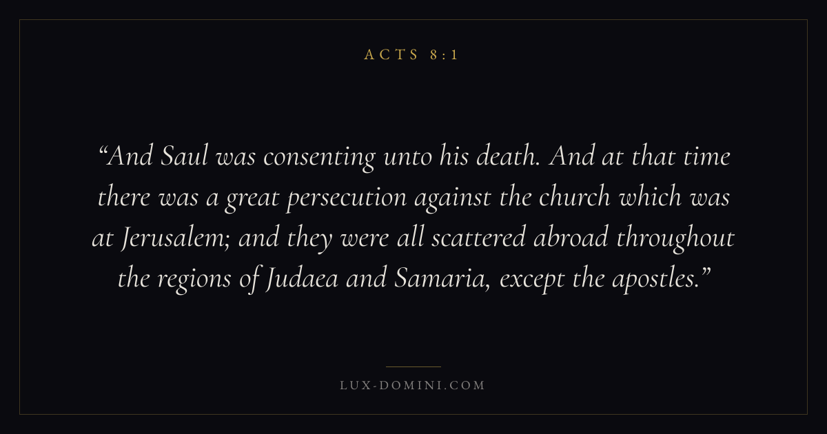 And Saul was consenting unto his death. And at that time there was a great persecution against the church which was at Jerusalem; and they were all scattered abroad throughout the regions of Judaea and Samaria, except the apostles.