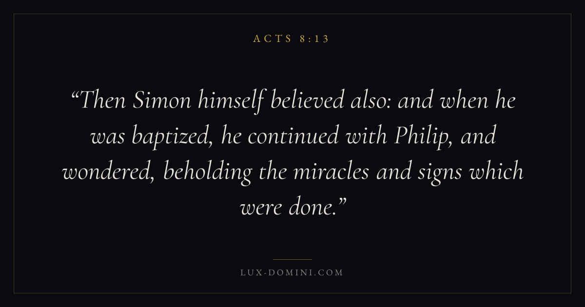 Then Simon himself believed also: and when he was baptized, he continued with Philip, and wondered, beholding the miracles and signs which were done.