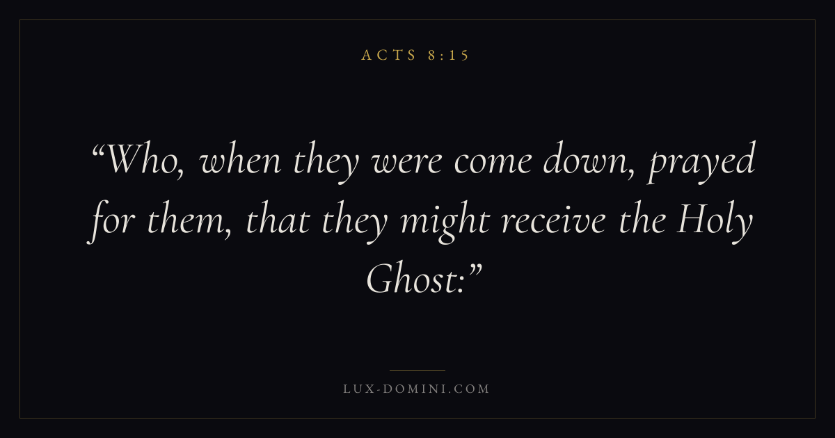 Books / Acts / Chapter 8 / Verse 15 ← Acts 8:14 Acts 8:15 Acts 8:16 → Who, when they were come down, prayed for them, that they might receive the Holy Ghost: Download verse card Share on Twitter Share on Facebook Pin it ✦ Key themes Suffering and trialsPrayerTruthSpirit Read with Acts 8:13Acts 8:14Romans 8:182 Corinthians 4:17 Related topics Bible verses about suffering and trialsBible verses about prayerBible verses about truth ✦ Acts Chapter 8 verses V. 1 V. 2 V. 3 V. 4 V. 5 V. 6 V. 7 V. 8 V. 9 V. 10 V. 11 V. 12 V. 13 V. 14 V. 15 V. 16 V. 17 V. 18 V. 19 V. 20 V. 21 V. 22 V. 23 V. 24 V. 25 V. 26 V. 27 V. 28 V. 29 V. 30 V. 31 V. 32 V. 33 V. 34 V. 35 V. 36 V. 37 V. 38 V. 39 V. 40
