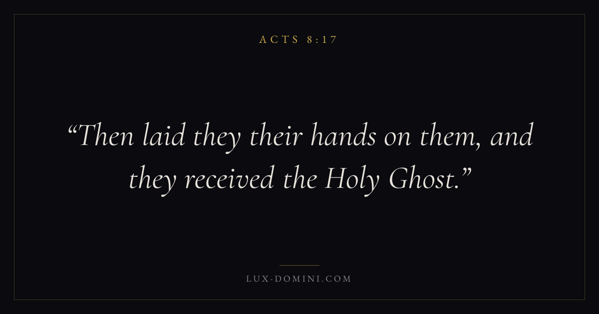 Books / Acts / Chapter 8 / Verse 17 ← Acts 8:16 Acts 8:17 Acts 8:18 → Then laid they their hands on them, and they received the Holy Ghost. Download verse card Share on Twitter Share on Facebook Pin it ✦ Key themes Suffering and trialsPrayerTruthSpirit Read with Acts 8:13Acts 8:14Romans 8:182 Corinthians 4:17 Related topics Bible verses about suffering and trialsBible verses about prayerBible verses about truth ✦ Acts Chapter 8 verses V. 1 V. 2 V. 3 V. 4 V. 5 V. 6 V. 7 V. 8 V. 9 V. 10 V. 11 V. 12 V. 13 V. 14 V. 15 V. 16 V. 17 V. 18 V. 19 V. 20 V. 21 V. 22 V. 23 V. 24 V. 25 V. 26 V. 27 V. 28 V. 29 V. 30 V. 31 V. 32 V. 33 V. 34 V. 35 V. 36 V. 37 V. 38 V. 39 V. 40