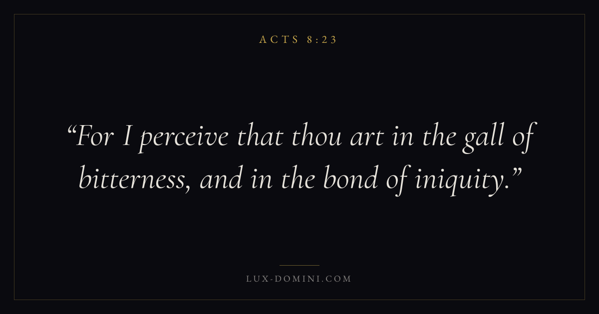 Books / Acts / Chapter 8 / Verse 23 ← Acts 8:22 Acts 8:23 Acts 8:24 → For I perceive that thou art in the gall of bitterness, and in the bond of iniquity. Download verse card Share on Twitter Share on Facebook Pin it ✦ Key themes Suffering and trialsPrayerTruthSpirit Read with Acts 8:22Acts 8:24Romans 8:182 Corinthians 4:17 Related topics Bible verses about suffering and trialsBible verses about prayerBible verses about truth ✦ Acts Chapter 8 verses V. 1 V. 2 V. 3 V. 4 V. 5 V. 6 V. 7 V. 8 V. 9 V. 10 V. 11 V. 12 V. 13 V. 14 V. 15 V. 16 V. 17 V. 18 V. 19 V. 20 V. 21 V. 22 V. 23 V. 24 V. 25 V. 26 V. 27 V. 28 V. 29 V. 30 V. 31 V. 32 V. 33 V. 34 V. 35 V. 36 V. 37 V. 38 V. 39 V. 40