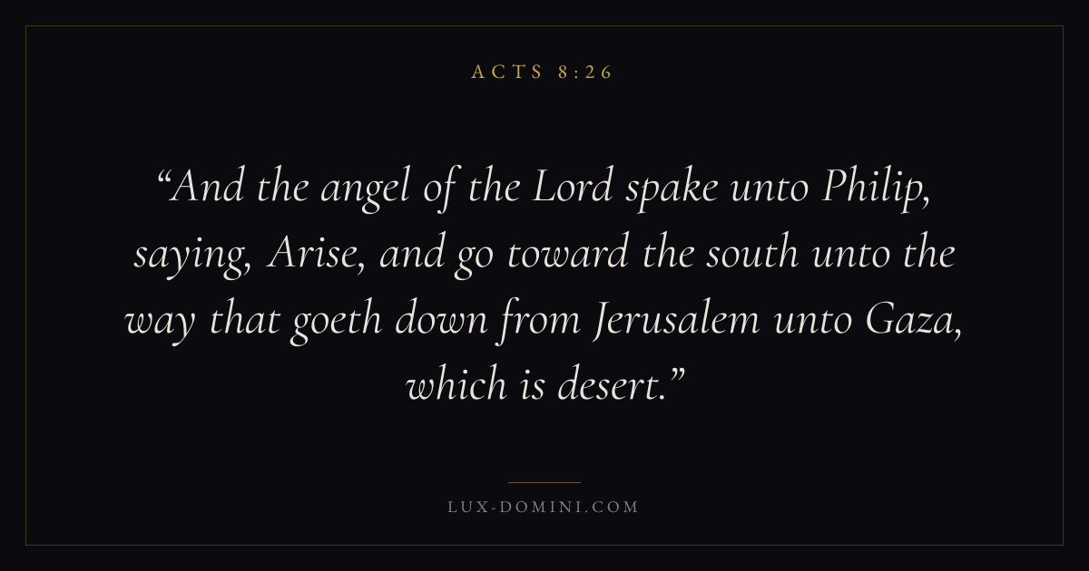 And the angel of the Lord spake unto Philip, saying, Arise, and go toward the south unto the way that goeth down from Jerusalem unto Gaza, which is desert.