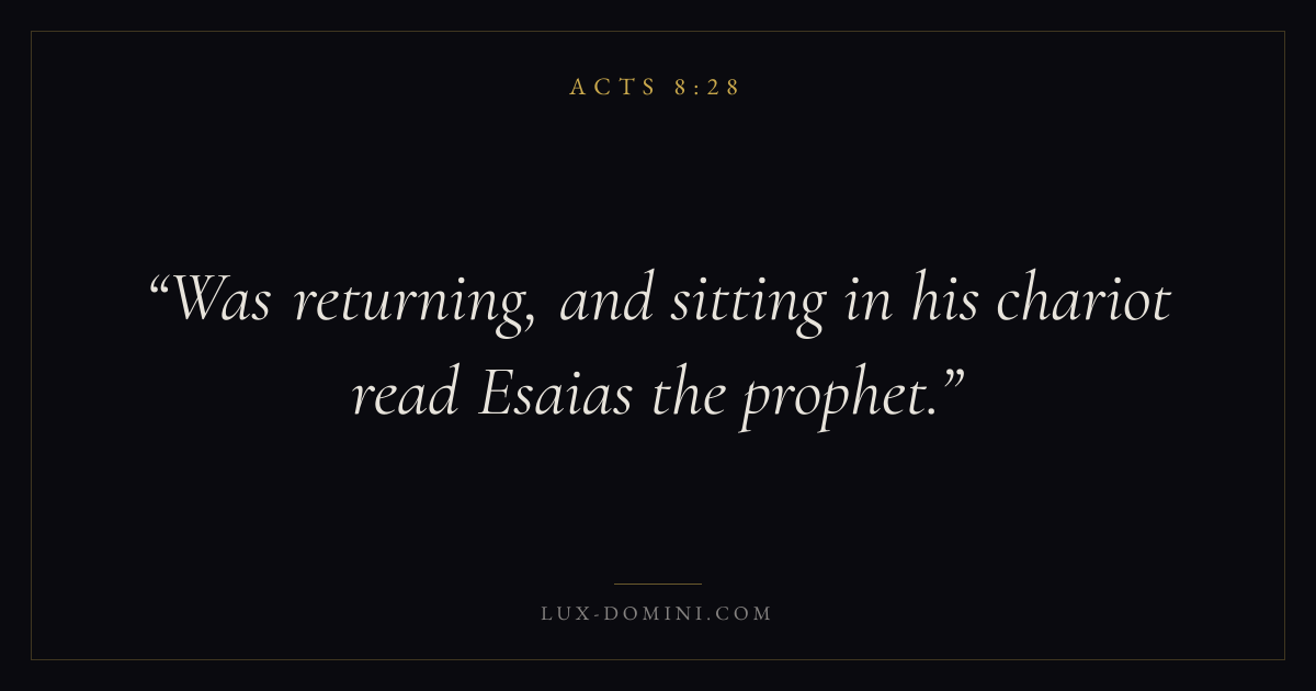 Books / Acts / Chapter 8 / Verse 28 ← Acts 8:27 Acts 8:28 Acts 8:29 → Was returning, and sitting in his chariot read Esaias the prophet. Download verse card Share on Twitter Share on Facebook Pin it ✦ Key themes Suffering and trialsPrayerTruthSpirit Read with Acts 8:27Acts 8:29Romans 8:182 Corinthians 4:17 Related topics Bible verses about suffering and trialsBible verses about prayerBible verses about truth ✦ Acts Chapter 8 verses V. 1 V. 2 V. 3 V. 4 V. 5 V. 6 V. 7 V. 8 V. 9 V. 10 V. 11 V. 12 V. 13 V. 14 V. 15 V. 16 V. 17 V. 18 V. 19 V. 20 V. 21 V. 22 V. 23 V. 24 V. 25 V. 26 V. 27 V. 28 V. 29 V. 30 V. 31 V. 32 V. 33 V. 34 V. 35 V. 36 V. 37 V. 38 V. 39 V. 40