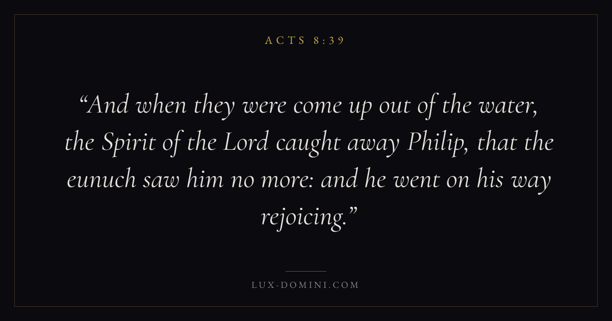 And when they were come up out of the water, the Spirit of the Lord caught away Philip, that the eunuch saw him no more: and he went on his way rejoicing.