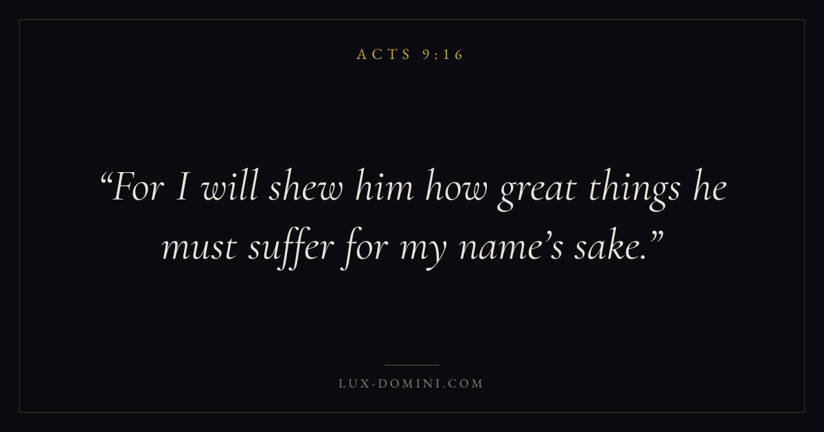 Books / Acts / Chapter 9 / Verse 16 ← Acts 9:15 Acts 9:16 Acts 9:17 → For I will shew him how great things he must suffer for my name’s sake. Download verse card Share on Twitter Share on Facebook Pin it ✦ Key themes Suffering and trialsPrayerTruthSpirit Read with Acts 9:15Acts 9:17Romans 8:182 Corinthians 4:17 Related topics Bible verses about suffering and trialsBible verses about prayerBible verses about truth ✦ Acts Chapter 9 verses V. 1 V. 2 V. 3 V. 4 V. 5 V. 6 V. 7 V. 8 V. 9 V. 10 V. 11 V. 12 V. 13 V. 14 V. 15 V. 16 V. 17 V. 18 V. 19 V. 20 V. 21 V. 22 V. 23 V. 24 V. 25 V. 26 V. 27 V. 28 V. 29 V. 30 V. 31 V. 32 V. 33 V. 34 V. 35 V. 36 V. 37 V. 38 V. 39 V. 40 V. 41 V. 42 V. 43