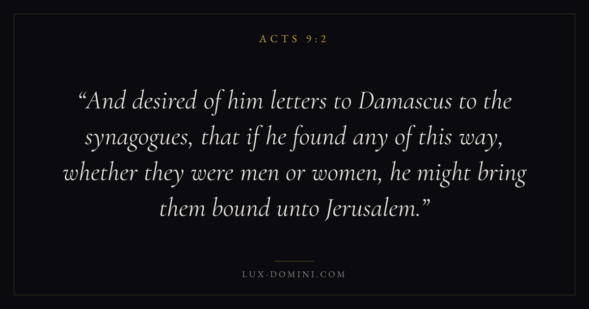 And desired of him letters to Damascus to the synagogues, that if he found any of this way, whether they were men or women, he might bring them bound unto Jerusalem.