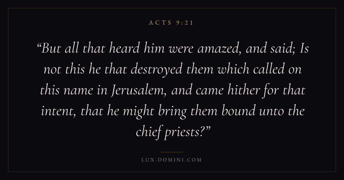 But all that heard him were amazed, and said; Is not this he that destroyed them which called on this name in Jerusalem, and came hither for that intent, that he might bring them bound unto the chief priests?