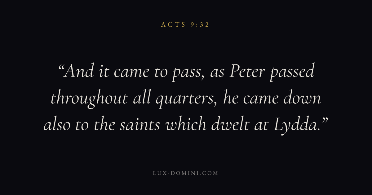 And it came to pass, as Peter passed throughout all quarters, he came down also to the saints which dwelt at Lydda.