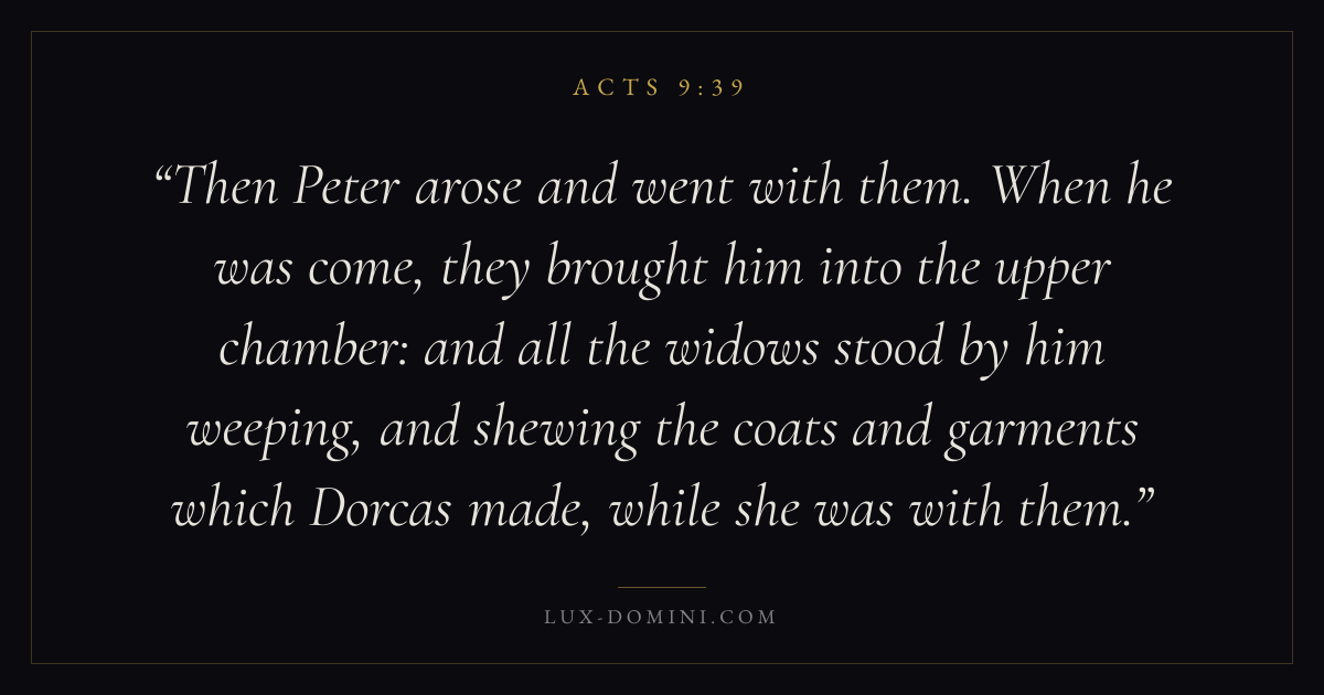 Then Peter arose and went with them. When he was come, they brought him into the upper chamber: and all the widows stood by him weeping, and shewing the coats and garments which Dorcas made, while she was with them.